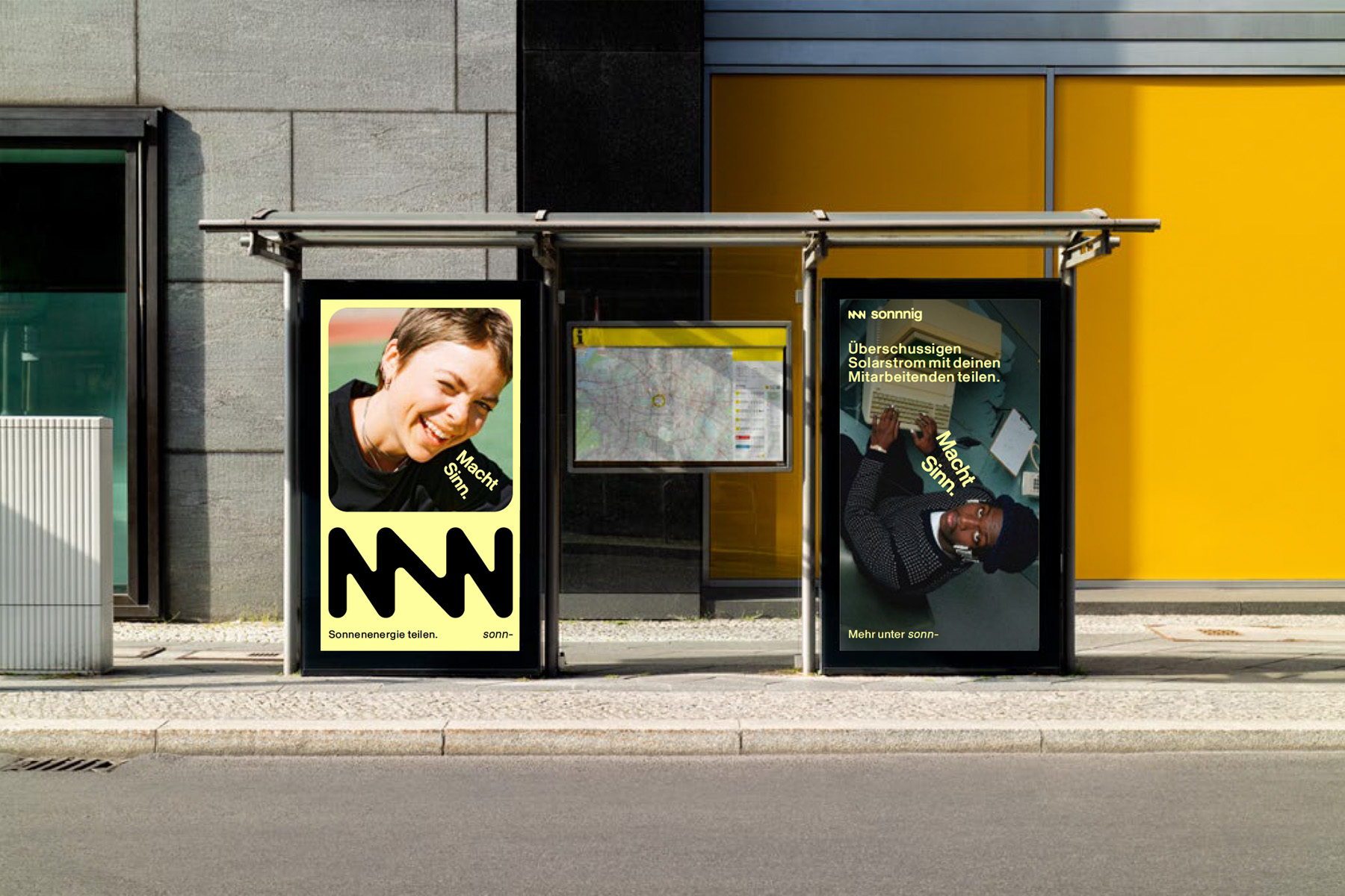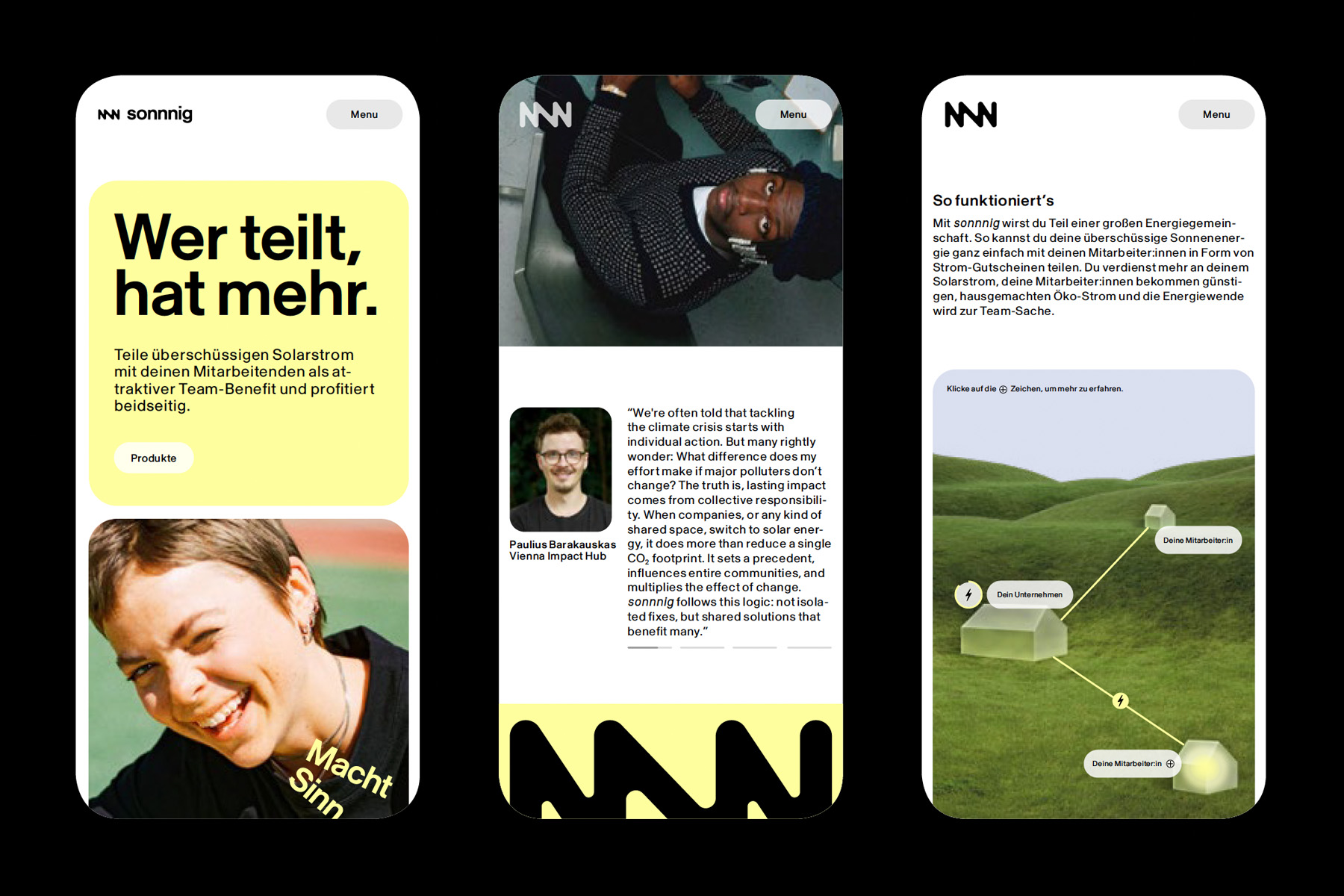 Das neue Branding soll visuell die Idee erklären und gleichzeitig ihre Einfachheit betonen. Der neue Claim „Macht Sinn“ (was weitläufig als grammatischer Stilfehler gilt) ist bewusst umgangssprachlich und spricht vor allem den Alltagsmenschen am Land an; dort, wo ein Großteil der Firmen bereits auf Photovoltaik setzt. Gleichzeitig ist er ein Wink mit dem Zaunpfahl, denn sonnnig ergibt Sinn aus ganz unterschiedlichen Perspektiven: Für Unternehmen, die mehr bei Einspeisung verdienen und gleichzeitig einen einzigartiges Employer Benefit schaffen, für Mitarbeitende, die spürbar Stromkosten sparen, und für die Umwelt, da der Sonnenstrom regional abgerechnet und auch verbraucht wird.